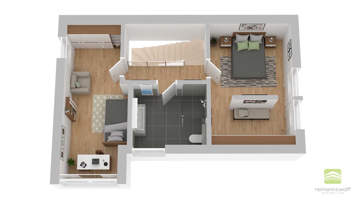 Ebenfalls glänzen zusätzlich die beiden Schlafräume und das geräumige Badezimmer auf der höheren Wohnebene.