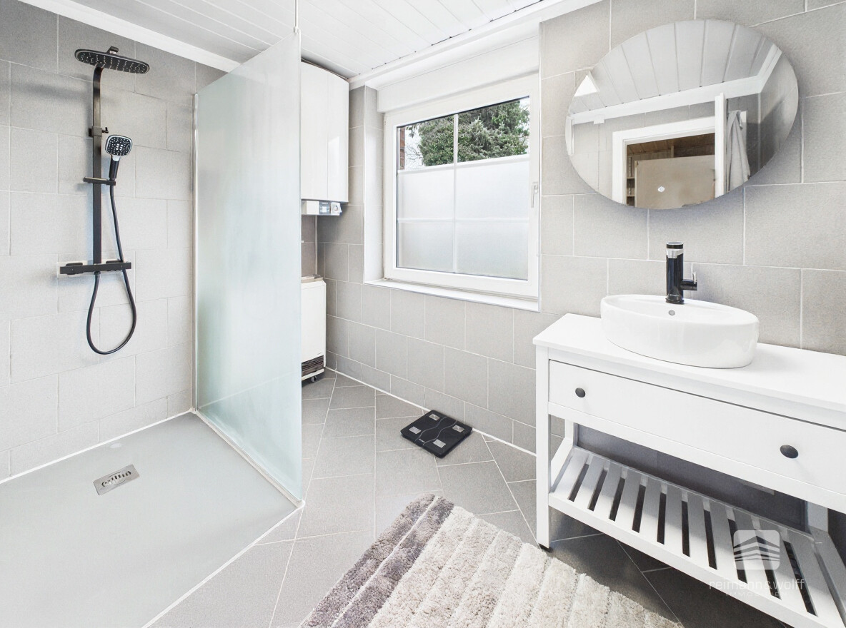 Im Jahr 2024 erhielt das Badezimmer eine stilvolle Modernisierung und präsentiert sich nun in einem zeitlosen, eleganten Design. Hochwertige, anthrazitfarbene Wand- und Bodenfliesen verleihen dem Raum eine ruhige, edle Ausstrahlung. Die ebenerdige Dusche fügt sich harmonisch in das Gesamtbild ein und bietet ein großzügiges, komfortables Duschvergnügen – ein Ort, an dem Sie entspannt in den Tag starten oder ihn genussvoll ausklingen lassen.
