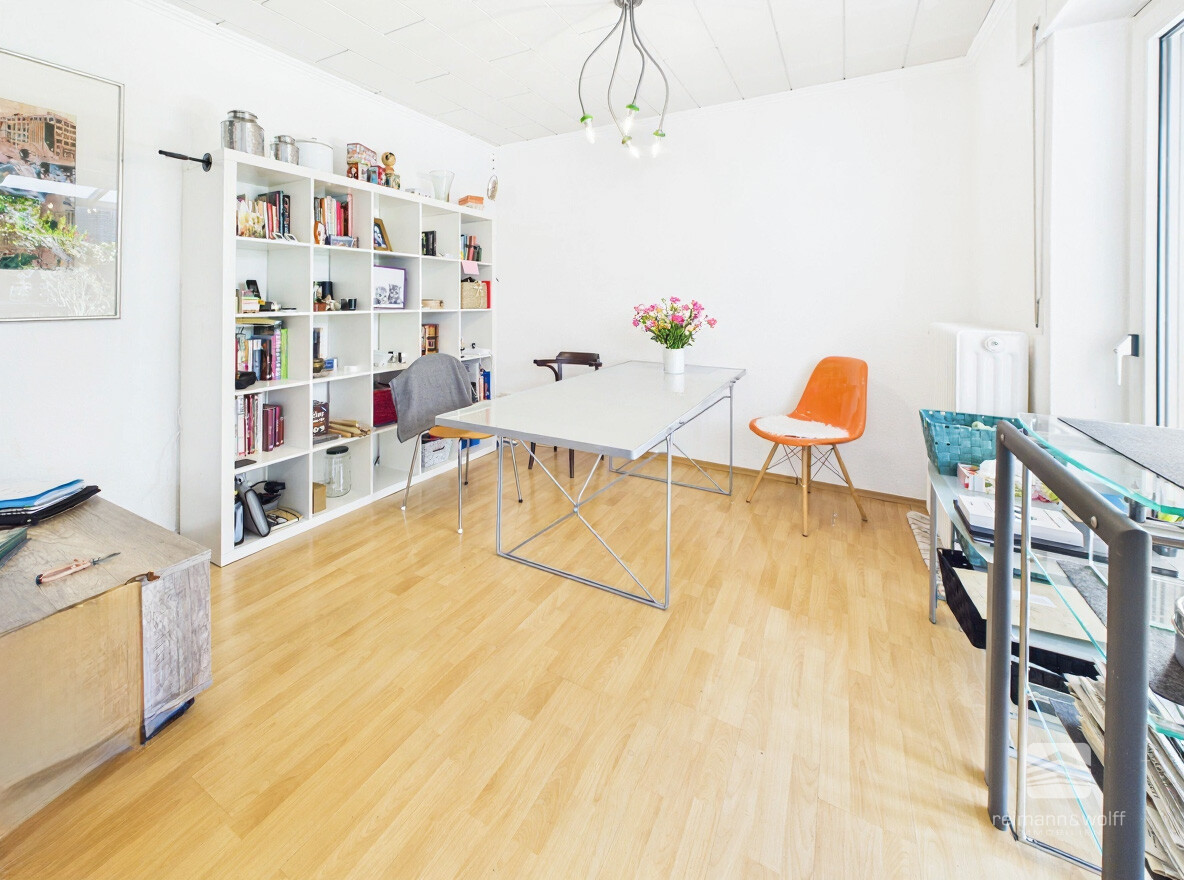 Klar gestaltete Wände in Weiß lassen viel Licht wirken, während gepflegte Laminatböden in warmer Holzoptik eine wohnliche Atmosphäre entfalten.
