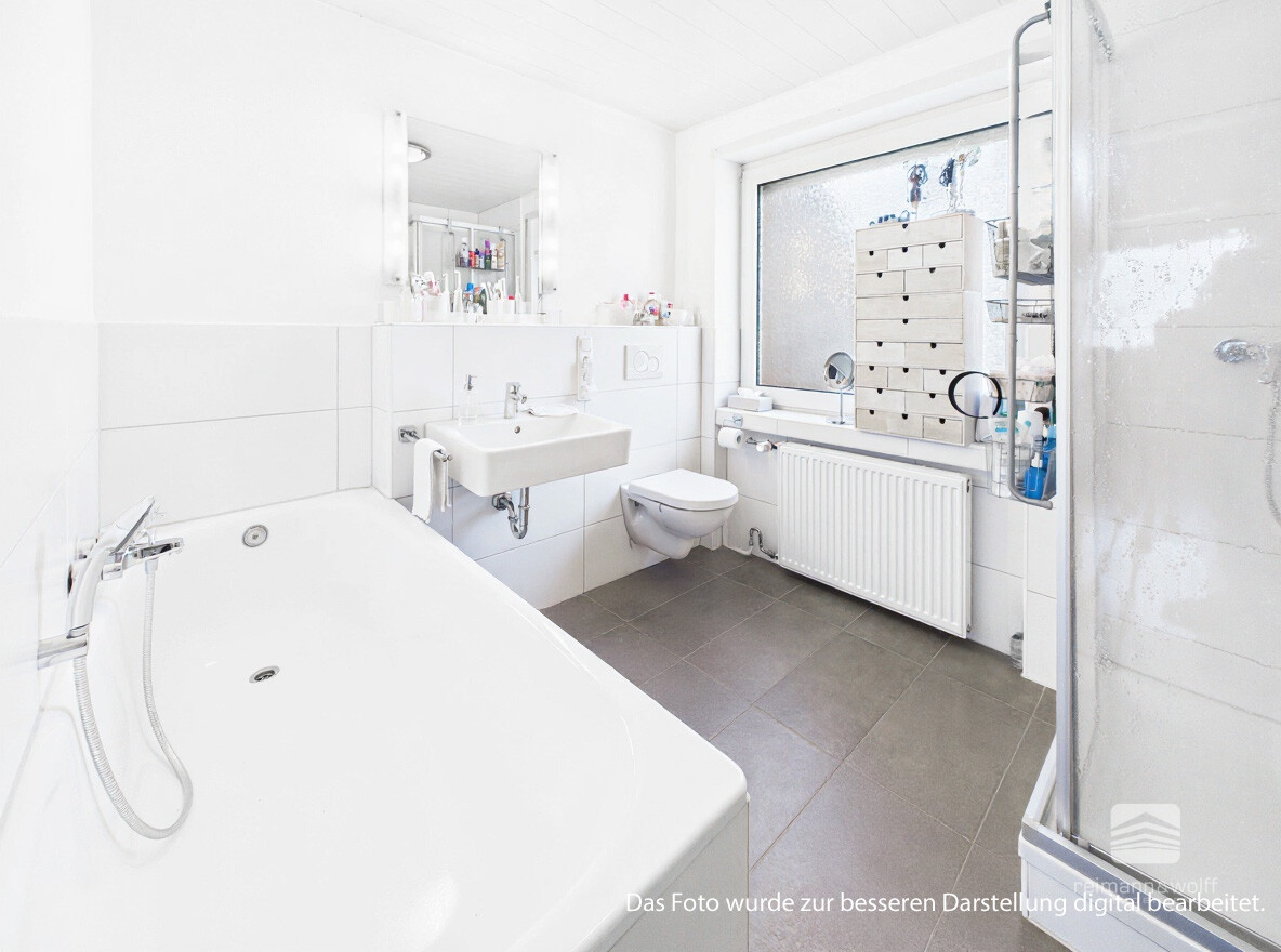 Ein besonderes Plus sind die modernisierten Sanitärräume. Das stilvoll erneuerte Badezimmer empfängt Sie mit viel Tageslicht, Badewanne und Dusche – ein Ort der Erholung und Klarheit. Auch das Gäste-WC wurde zeitgemäß gestaltet und präsentiert sich ansprechend und frisch.
