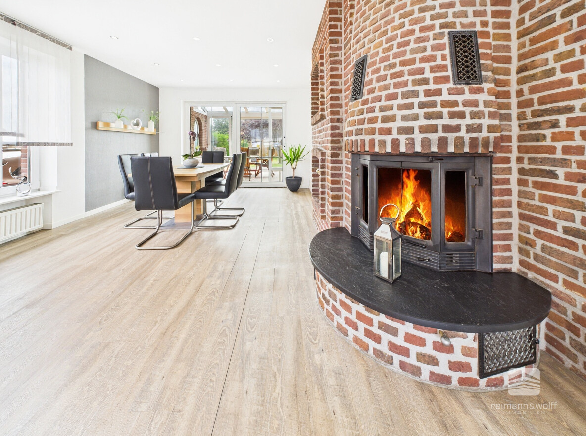 Der weitläufige Wohn- und Essbereich begeistert mit einer warmen, einladenden Atmosphäre. Der Kaminofen sorgt in der kälteren Jahreszeit für behagliche Wärme und verleiht dem Raum eine ganz besondere Ausstrahlung.