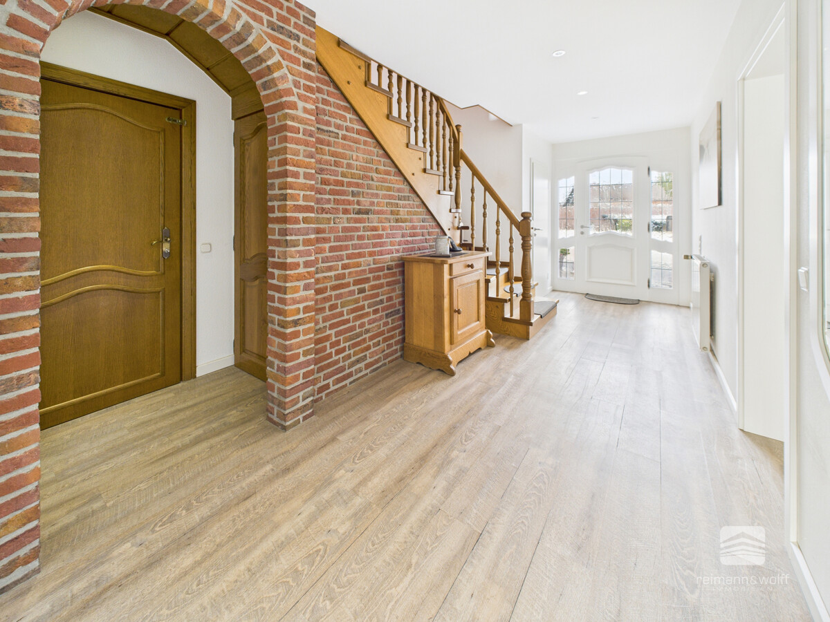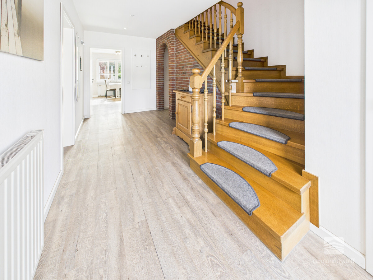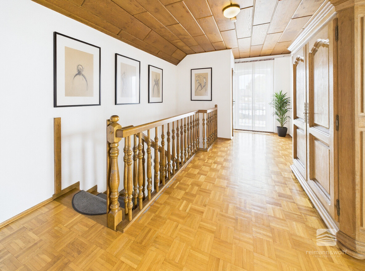 Über die formschöne Holztreppe gelangen Sie in das Obergeschoss, wo eine offene Galerie und der Flurbereich ein Gefühl von Weite vermitteln.