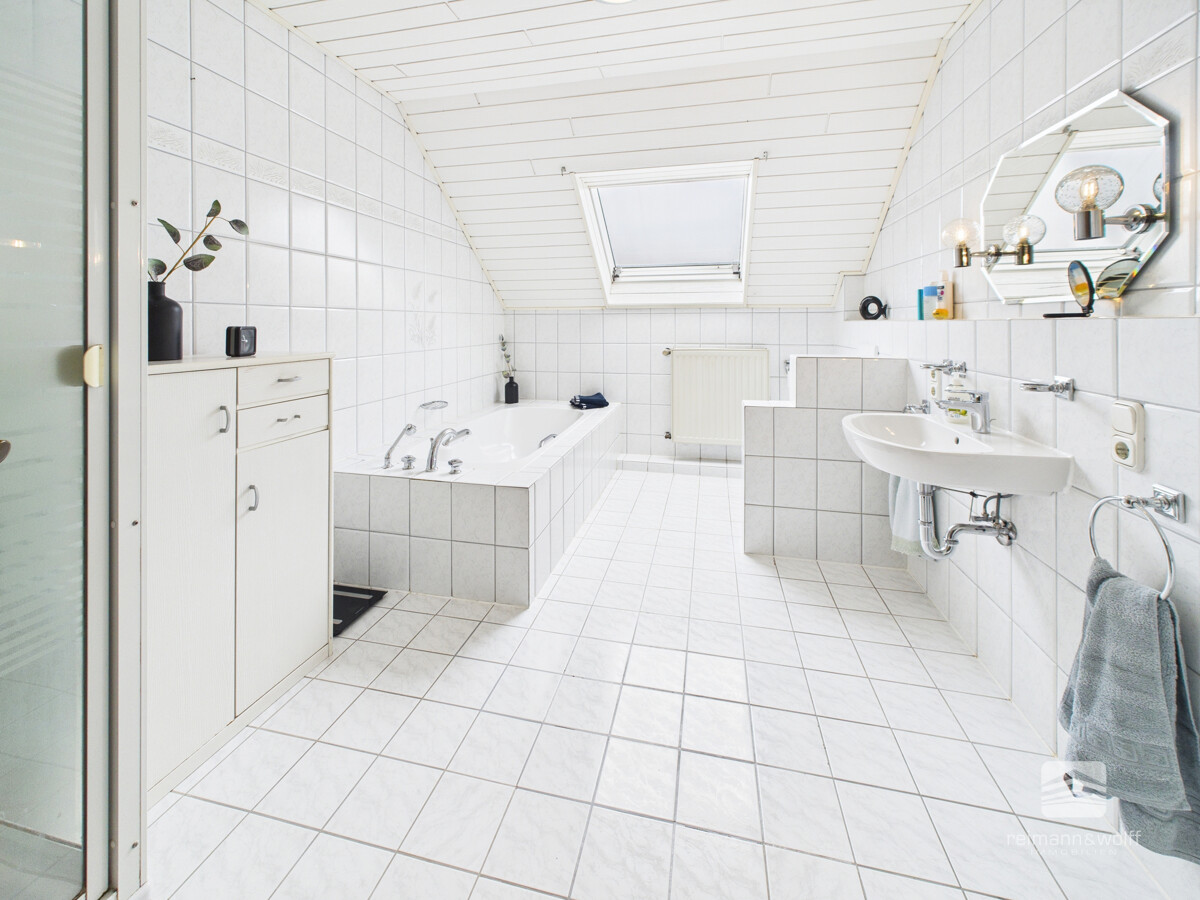 Das freundliche, lichtdurchflutete Badezimmer überzeugt mit einer Dusche und einer Eckbadewanne – perfekt für einen entspannten Start in den Tag oder ein wohltuendes Bad am Abend.