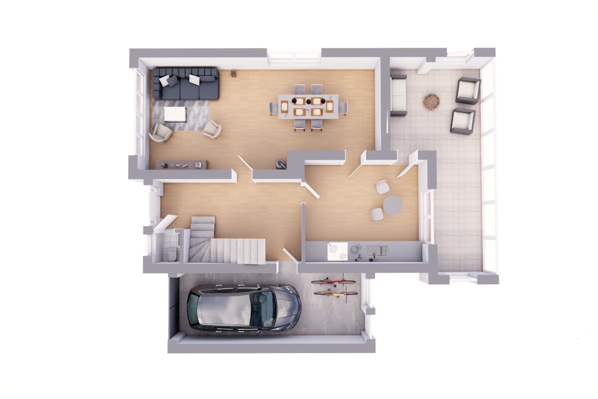 Eine einladende Diele, ein praktisches Gäste-WC sowie der direkte Zugang zur geräumigen Garage komplettieren diese Ebene auf ideale Weise.