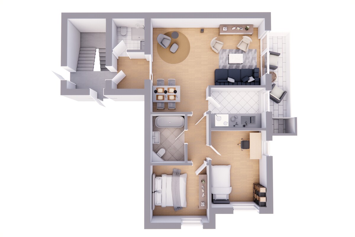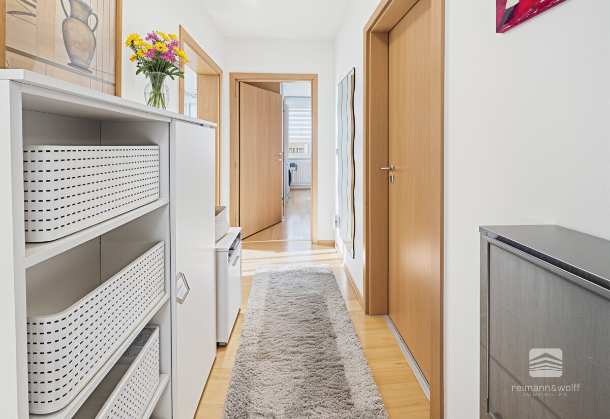 In den Wohn- und Schlafbereichen sorgt ein geschmackvoller Laminatboden für eine warme, behagliche Atmosphäre, während in Küche und Bädern helle, pflegeleichte Fliesen für ein frisches und freundliches Ambiente stehen.