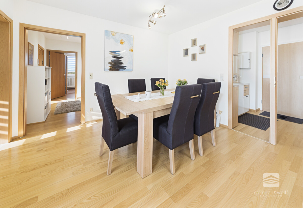 Der zentrale Wohnbereich verbindet harmonisch den gemütlichen Wohnraum mit dem einladenden Essplatz – ein Ort, an dem gemeinsame Stunden ebenso selbstverständlich sind wie Momente der Ruhe.
