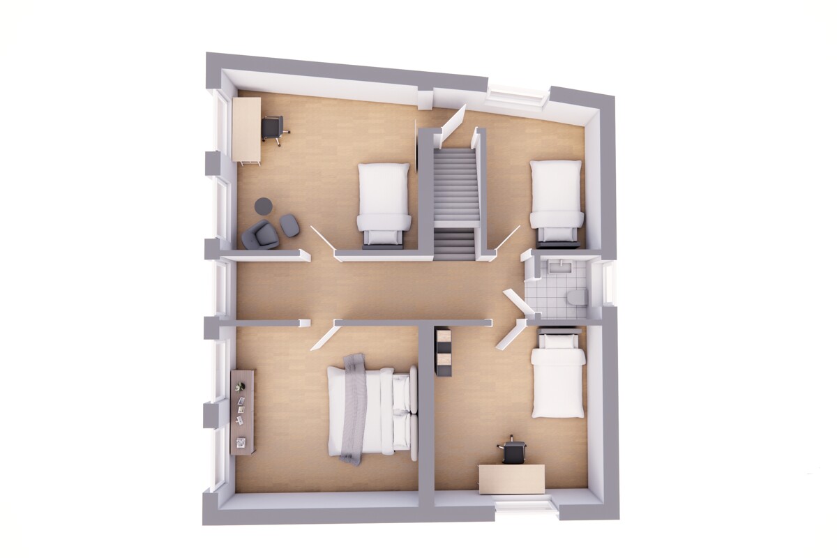Auf zwei Ebenen erwarten Sie insgesamt fünf behagliche Schlafzimmer, verteilt auf zwei Wohnebenen. Das Badezimmer kann mit etwas handwerklichem Geschick in eine Wohlfühloase verwandeln werden.