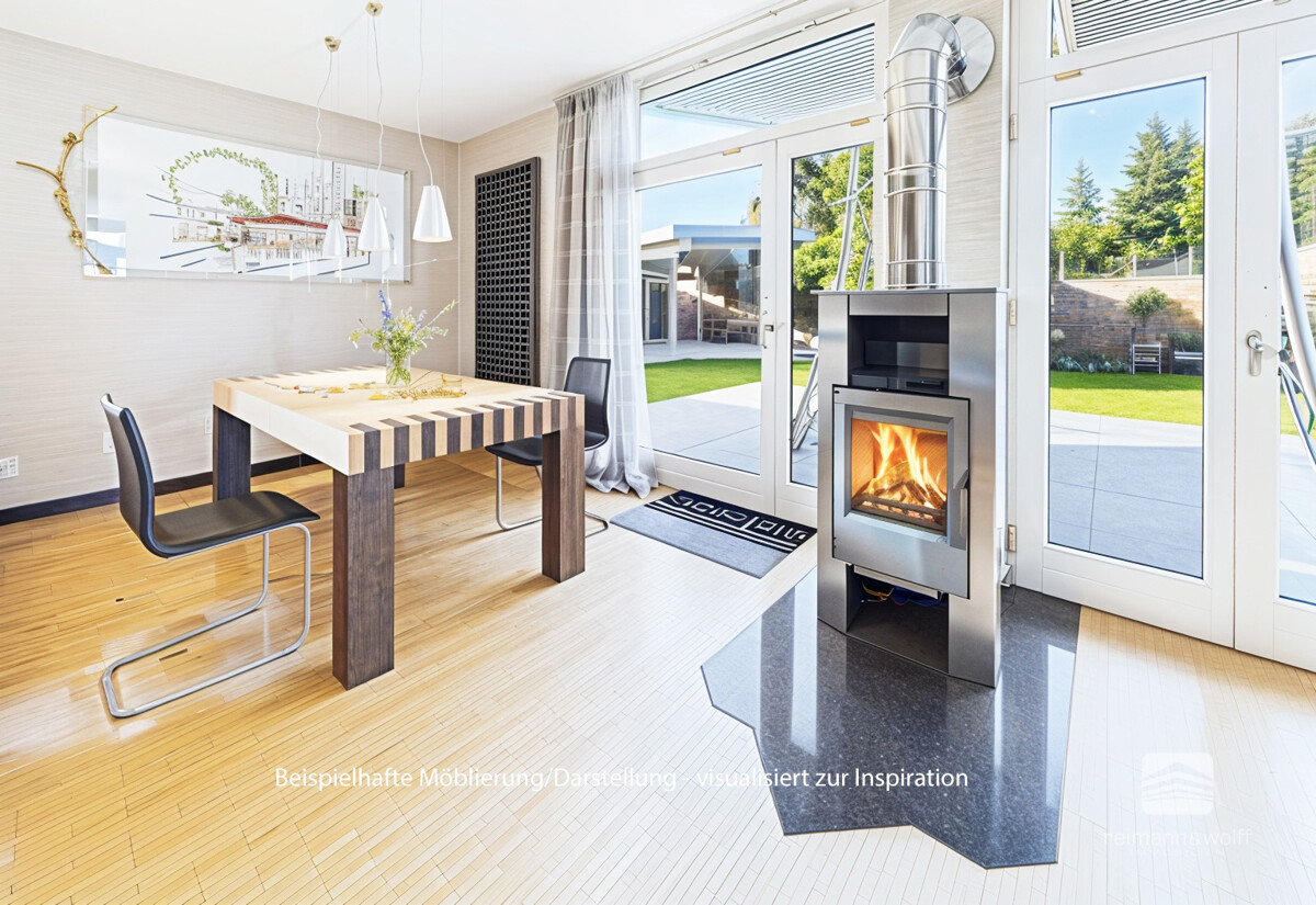 Ein besonderer Grundriss mit luftiger Raumaufteilung setzt architektonische Akzente und wird durch stilvolle Designer-Kaminöfen auf allen Wohnebenen eindrucksvoll ergänzt.