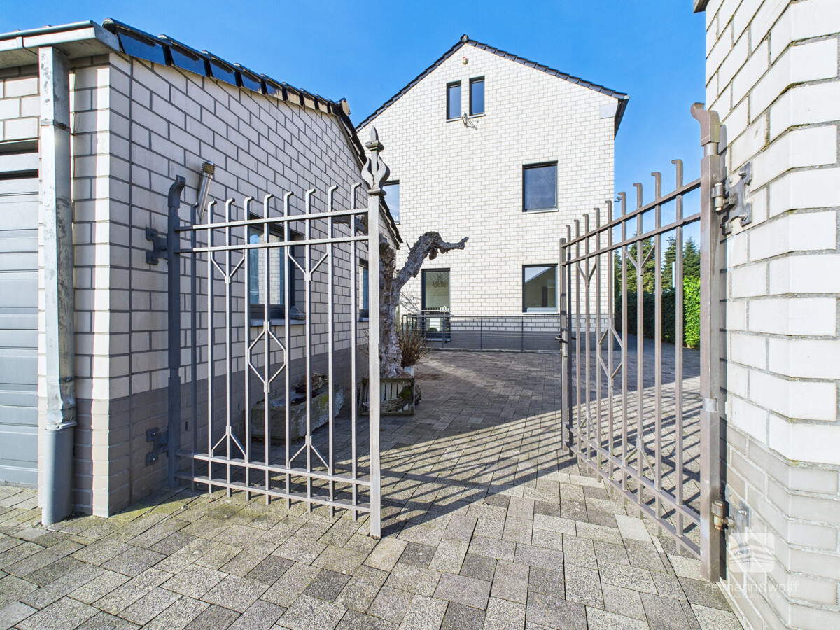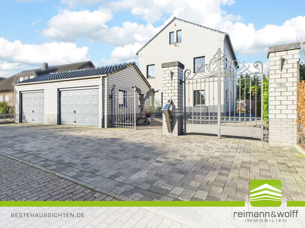 Der gepflasterte Hofbereich vermittelt einen repräsentativen ersten Eindruck, während sich die Doppelgarage formschön in das Gesamtbild einfügt.