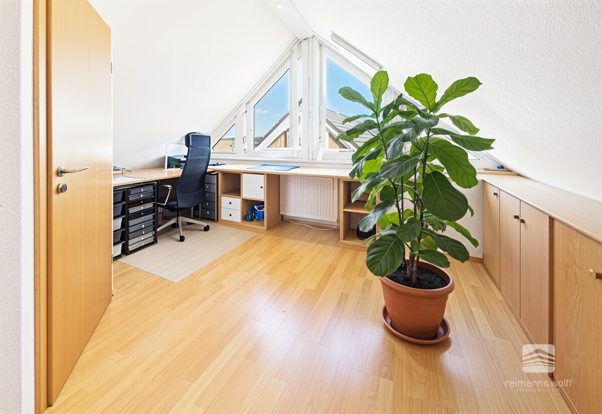 Ein weiteres Highlight befindet sich im ausgebauten Dachgeschoss: Das Studiozimmer eröffnet Ihnen zahlreiche Möglichkeiten. Ob als zusätzliches Schlafzimmer, inspirierendes Homeoffice oder kreativer Rückzugsort – hier entfaltet sich Raum für Ihre individuellen Wohnideen.
