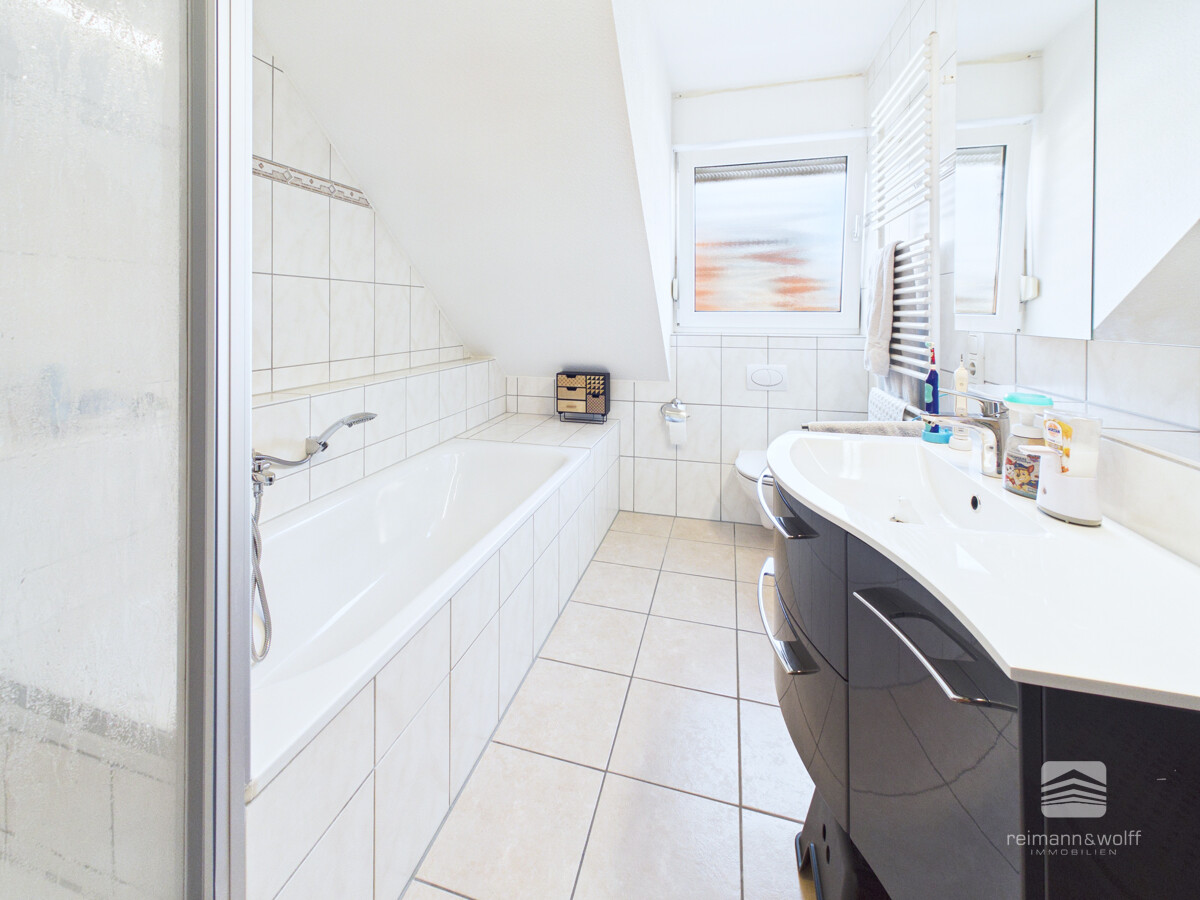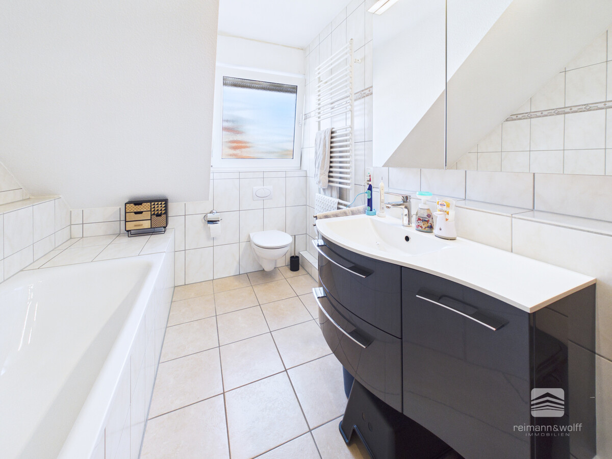Das Tageslichtbadezimmer begeistert mit einer entspannenden Badewanne sowie einer erfrischenden Dusche – ein Ort für wohltuende Momente und einen gelungenen Start in den Tag.