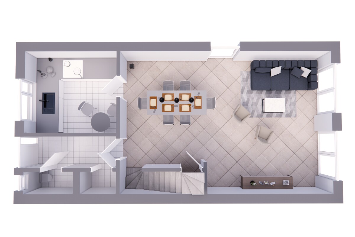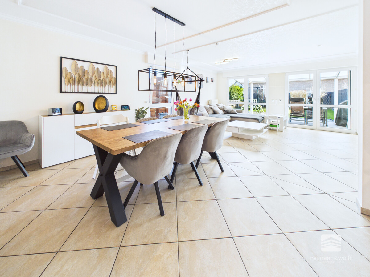 Im Inneren des Hauses erwartet Sie ein lichtdurchfluteter Wohnbereich, der Wohnen und Essen auf besonders interessante Weise miteinander verbindet. Große Fensterflächen lassen viel Tageslicht herein und schaffen eine freundliche, einladende Wohnatmosphäre.