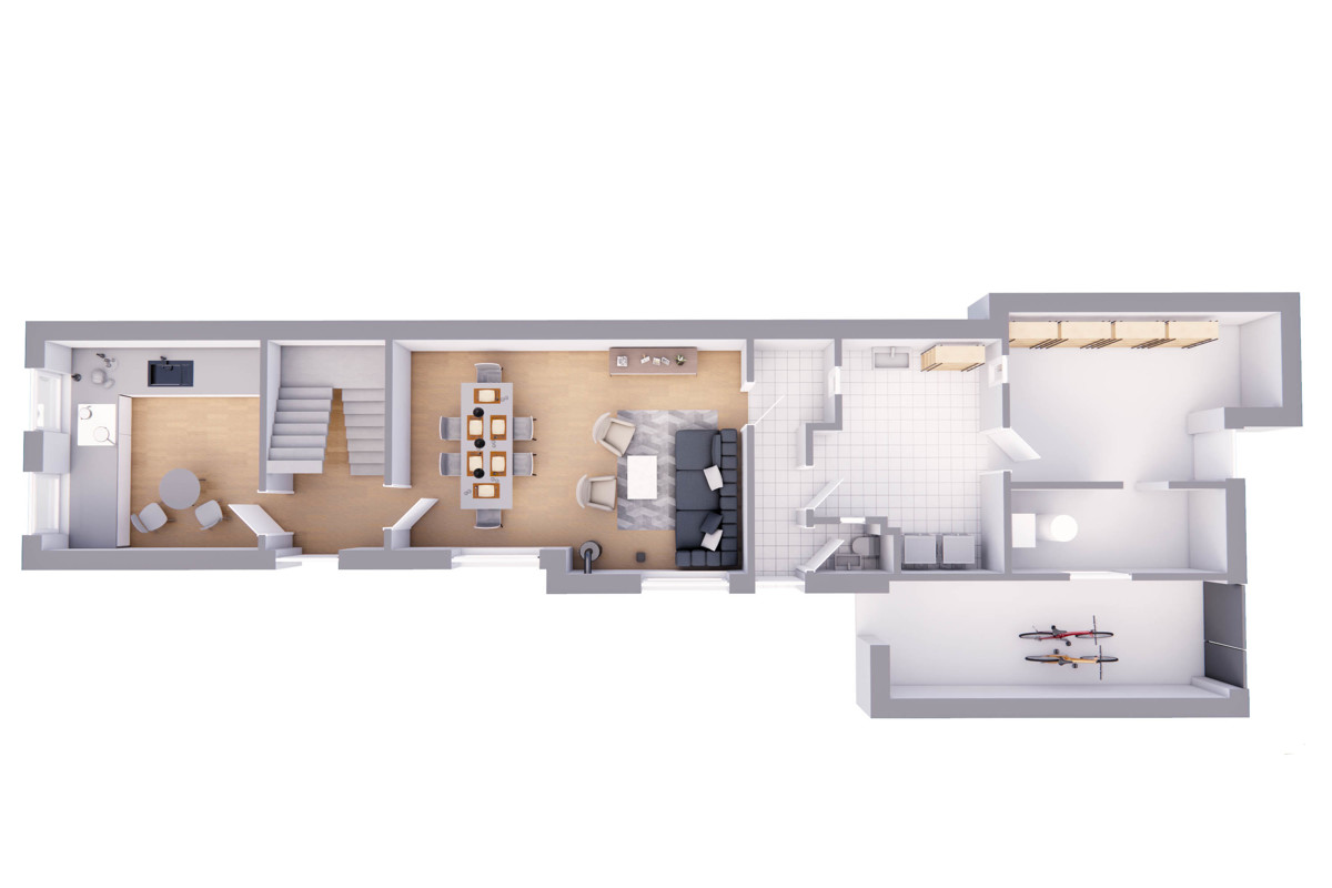 Das Herzstück bildet das geräumige Wohn-Esszimmer, das dank des Kamins an kühleren Tagen zusätzlich wohlige Wärme spendet und gemütliche Stunden verspricht.