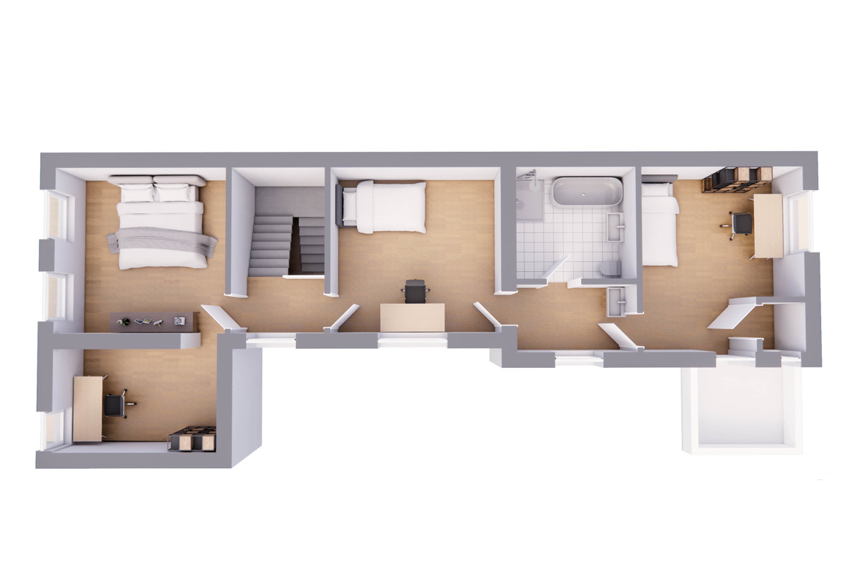 Mit bis zu vier Schlafzimmern, darunter eines mit eigenem Balkon, bietet dieses Haus ausreichend Rückzugsorte für jedes Familienmitglied. Eine Erweiterung durch das ggfs. ausbaufähige Dachgeschoss ist möglich.