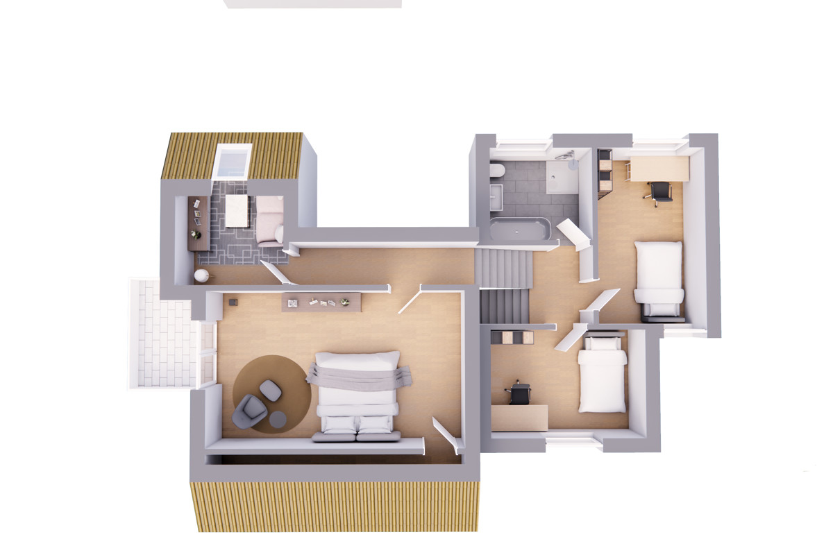 Die Split-Level-Architektur schenkt dem Haus Lebendigkeit und macht jedes Geschoss zu einem besonderen Erlebnis. Die geschickt versetzten Ebenen schaffen Rückzugsorte ebenso wie offene Flächen für gemeinsames Leben – perfekt zum Arbeiten, Spielen oder Entspannen.