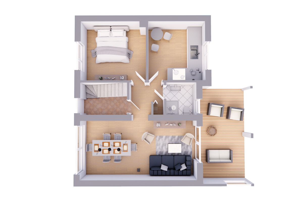 Das Herzstück des Hauses bildet das Wohn- und Esszimmer, von dem aus Sie direkt auf die charmante überdachte Terrasse treten. Hier schweift der Blick entspannt ins Grüne und über den Schwanderberg – eine Kulisse, die jeden Tag aufs Neue begeistert. Ob beim morgendlichen Kaffee oder dem geselligen Abendessen im Freien – dieser Ort wird schnell zu einem Ihrer Lieblingsplätze.