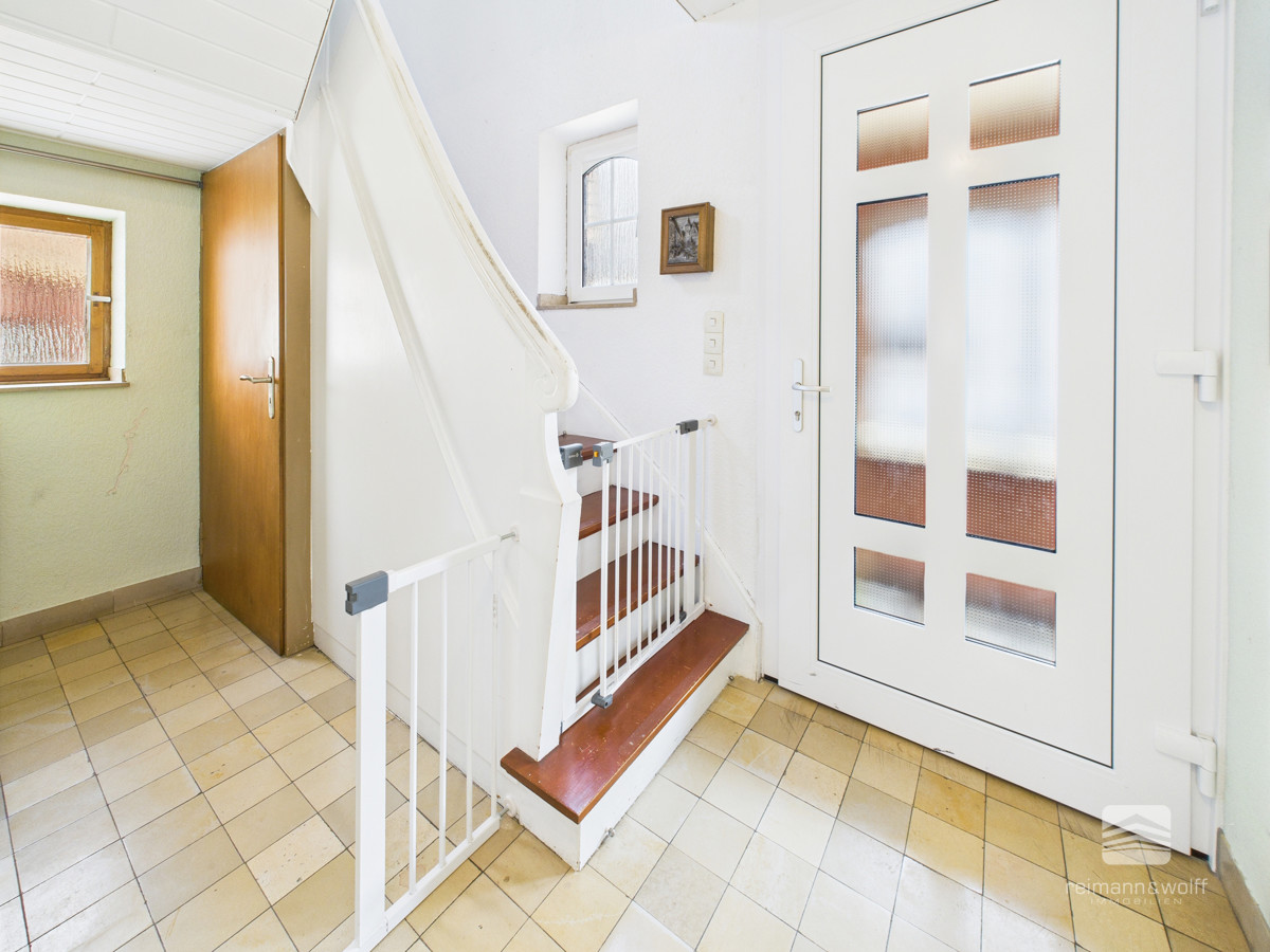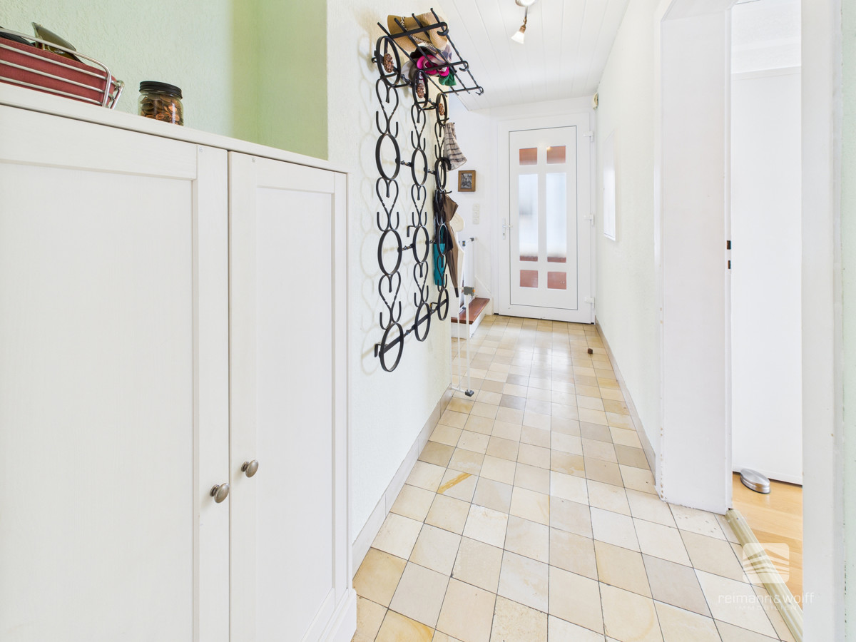 Innen überzeugt das Haus durch einen gelungenen Mix aus Alt und Neu: Die Fliesen im Flurbereich stammen noch aus der Bauzeit und verleihen dem Eingangsbereich einen besonderen Charakter.