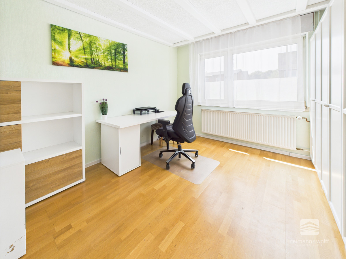 Der großzügige Wohnbereich im Erdgeschoss ist aktuell mit einem Raumteiler (keine massive Wand) unterteilt und beherbergt zusätzlich ein separates Büro – dieser Raum lässt sich problemlos als weiteres Schlafzimmer nutzen.
