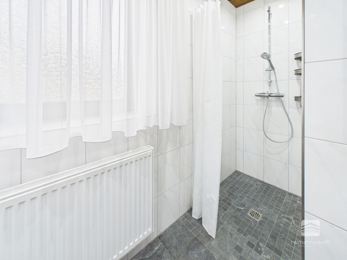 Das Badezimmer im Erdgeschoss präsentiert sich seit 2018 in modernem Design und überzeugt mit einer eleganten, ebenerdigen Dusche.
