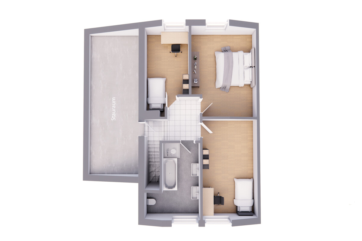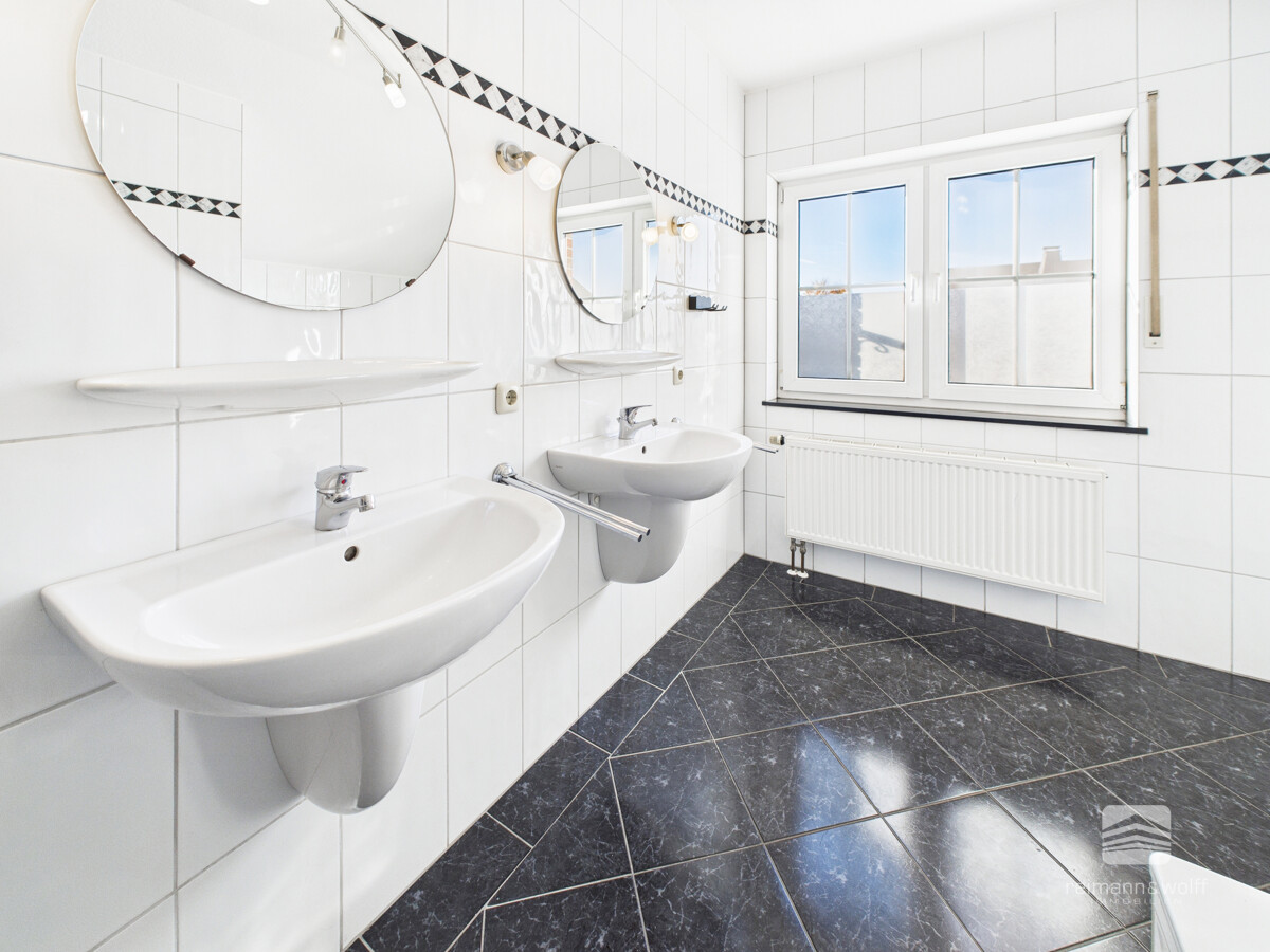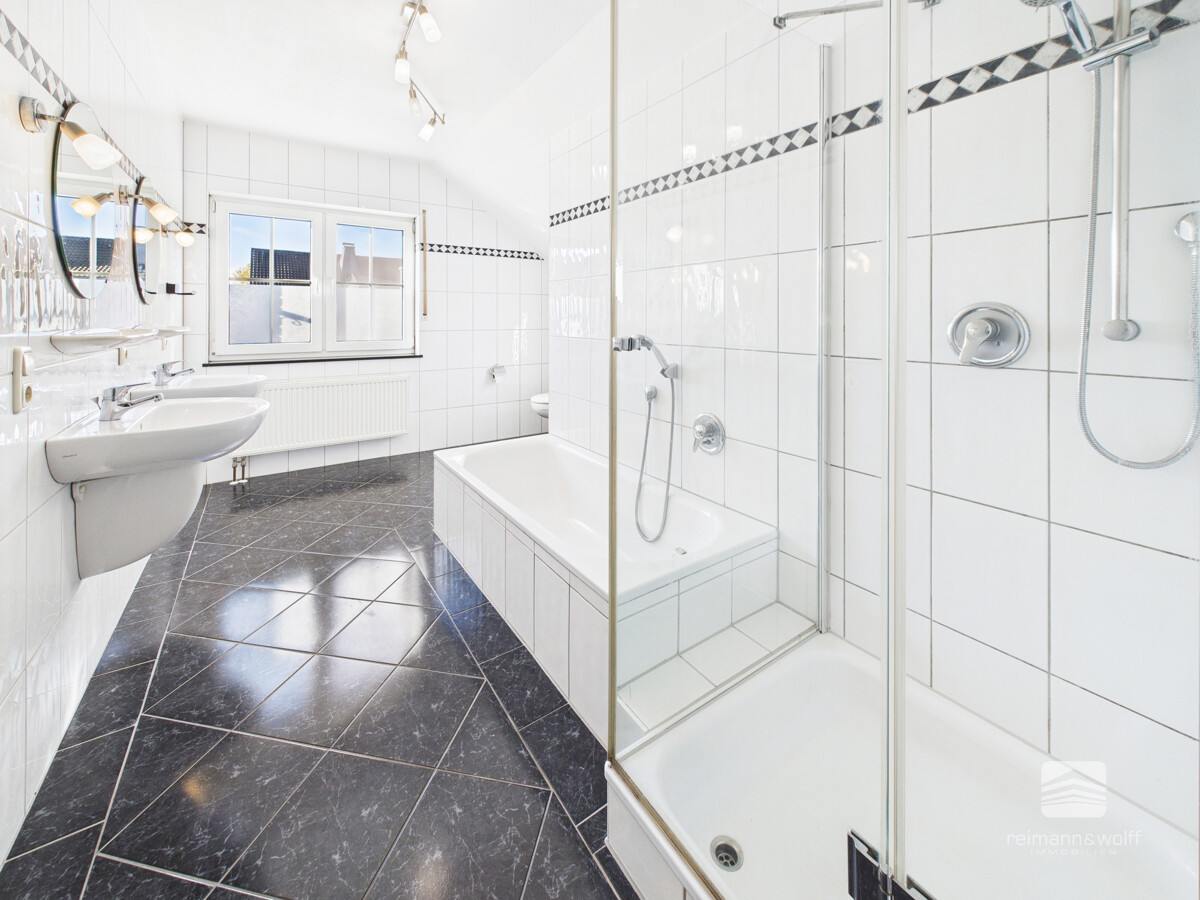 Im Obergeschoss erwarten Sie drei gemütliche Schlafzimmer sowie ein zeitlos gestaltetes, helles Badezimmer mit Dusche, Badewanne und zwei Waschbecken – ideale Voraussetzungen für einen angenehmen Start in den Tag und ebenso entspannende Abendstunden.