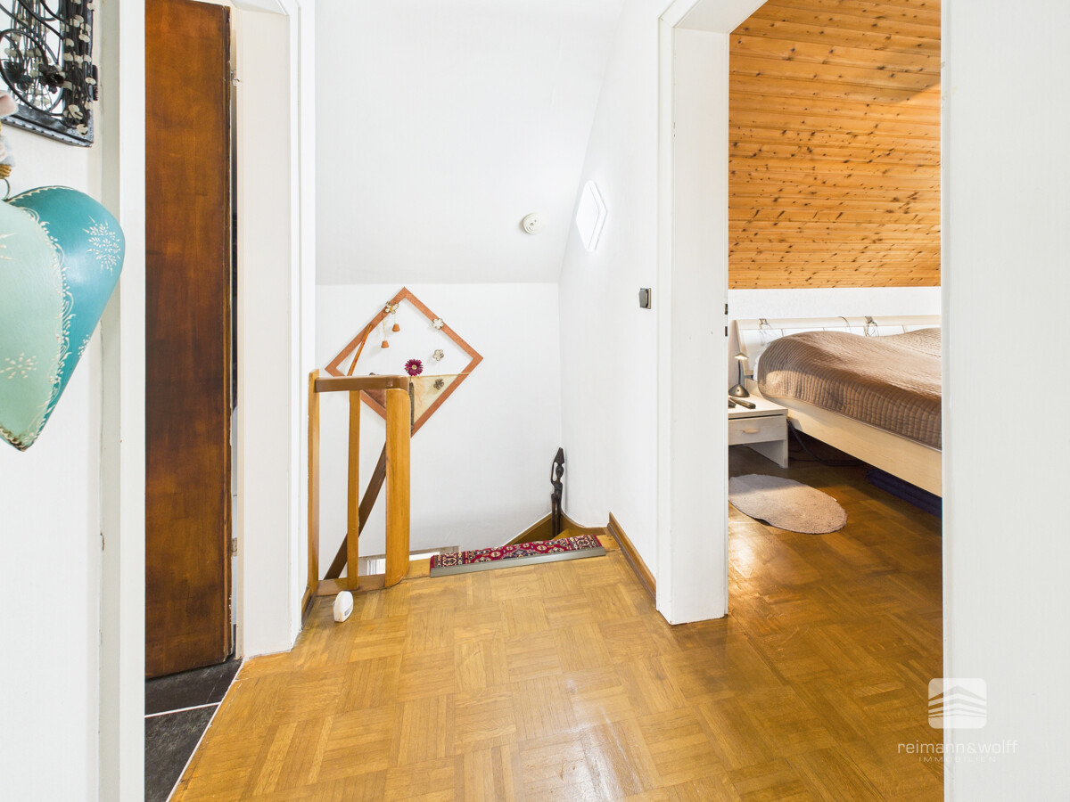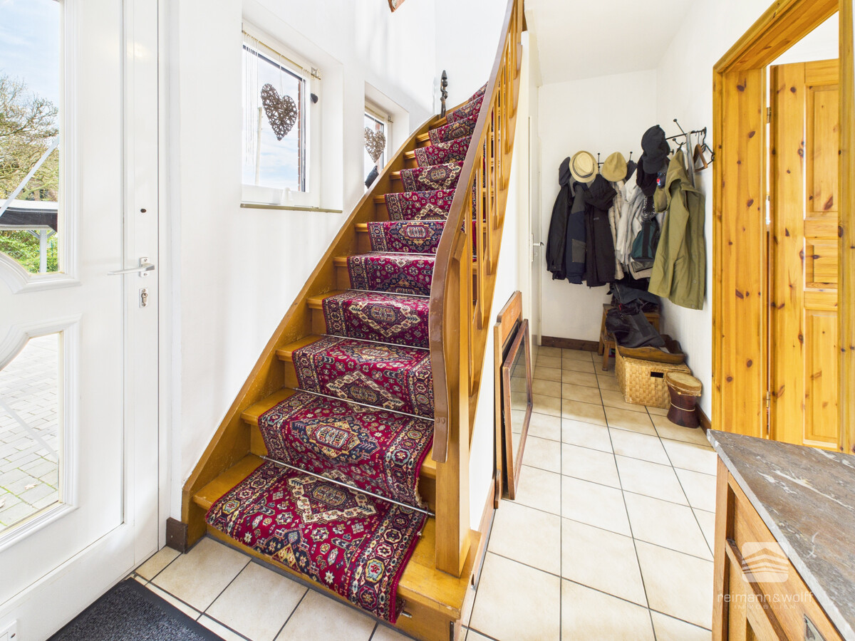 Die Dielenböden bringen eine natürliche Lebendigkeit mit, die formschöne Holztreppe setzt einen eleganten Akzent und die liebevolle Detailgestaltung rundet das harmonische Gesamtbild ab.