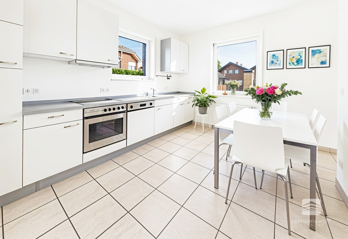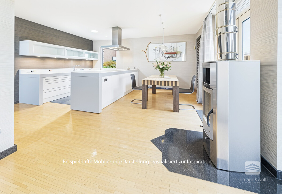 Die hochwertig ausgestattete Küche präsentiert sich als stilvoller Mittelpunkt des täglichen Lebens. Großzügige Arbeitsflächen, klare Linien und eine elegante Kochinsel bieten Raum für kulinarische Kreativität. Der angrenzende Essbereich öffnet sich mit großen Glasflächen zum Garten und begleitet gemeinsame Mahlzeiten mit viel Licht und Atmosphäre.