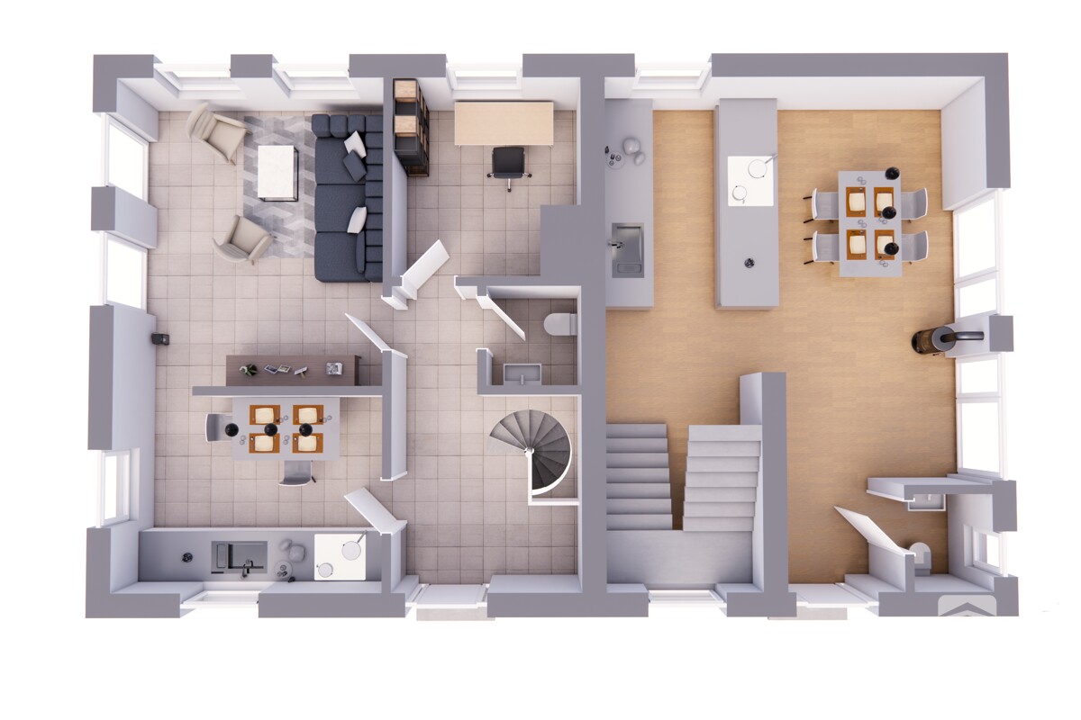 Die besondere Grundrissgestaltung schafft ein harmonisches Zusammenspiel aus offenen Bereichen und geschützten Rückzugszonen und bietet Ihnen ideale Voraussetzungen für Familienleben, Mehrgenerationenkonzepte oder die Verbindung von Wohnen und Arbeiten unter einem Dach.