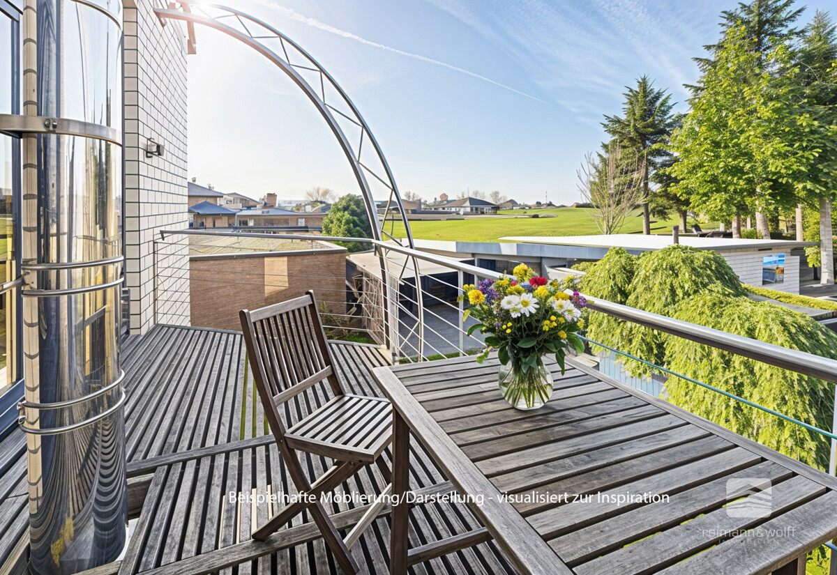 Terrasse und Balkon sind durch formschöne Edelstahlträger elegant verbunden und bilden gemeinsam ein architektonisches Highlight. Hier genießen Sie sonnige Stunden in ansprechender Umgebung.