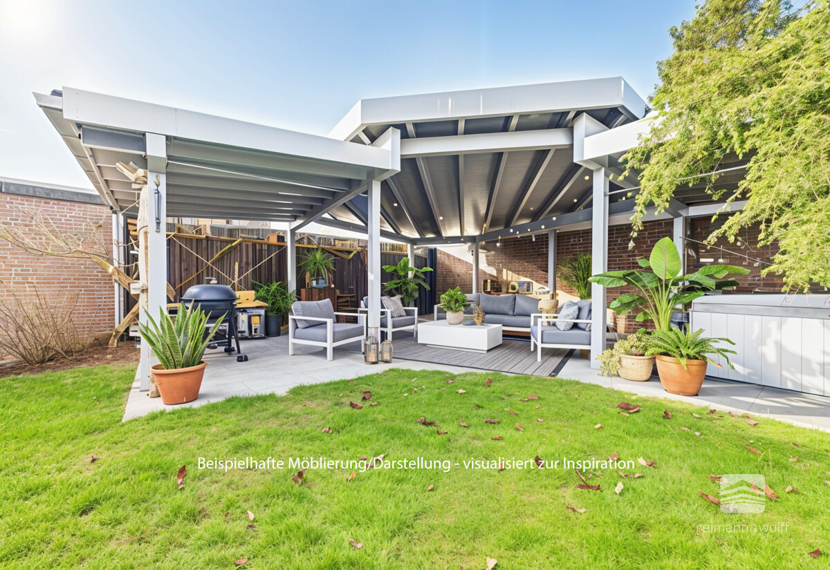Im Garten eröffnet sich Ihnen ein vielseitiger Außenbereich mit sonniger Terrasse, stilvollem Balkon sowie einem überdachten Freisitz, der als Lounge- und Grillecke zu entspannten Stunden und geselligen Abenden einlädt.