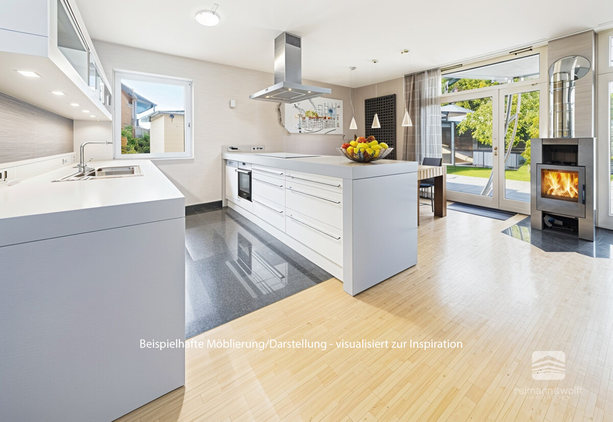 Ein besonderer Grundriss mit luftiger Raumaufteilung setzt architektonische Akzente und wird durch stilvolle Designer-Kaminöfen auf allen Wohnebenen eindrucksvoll ergänzt.