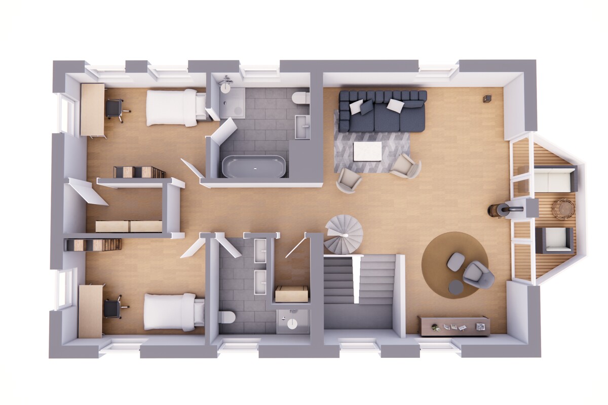 Im privaten Bereich genießen Sie geschmackvoll gestaltete Schlafräume mit ruhiger Farbgebung und großzügigen Fensterflächen für erholsame Nächte. Die Zimmer eignen sich ideal als Kinder-, Gäste- oder Arbeitsbereiche und überzeugen durch ihre freundliche Raumwirkung und flexible Nutzungsmöglichkeiten.