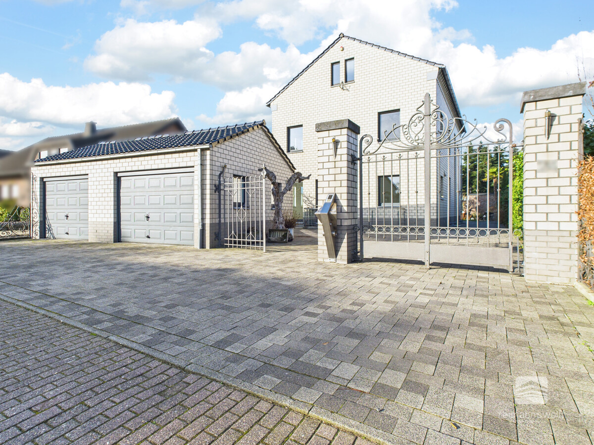 Der gepflasterte Hofbereich vermittelt einen repräsentativen ersten Eindruck, während sich die Doppelgarage formschön in das Gesamtbild einfügt.
