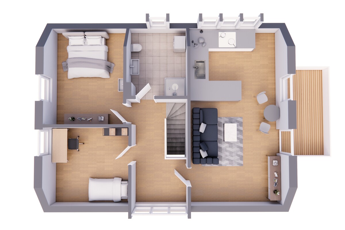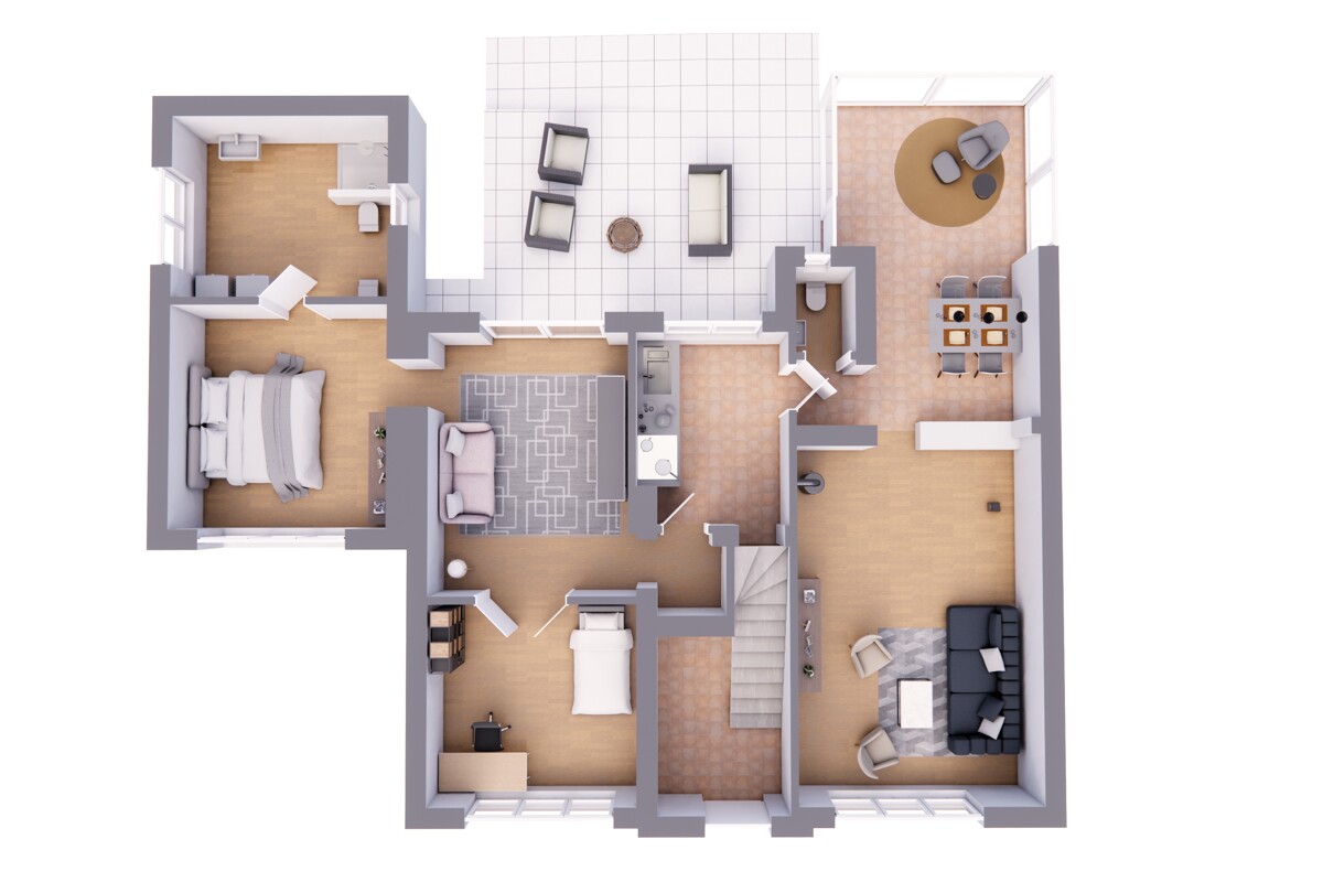 Der großzügige Wohnbereich mit angrenzender Küche bildet das Herzstück des Hauses. Drei weitere Zimmer eröffnen Ihnen vielfältige Nutzungsmöglichkeiten – ob als Schlafräume, Büro oder Gästezimmer.