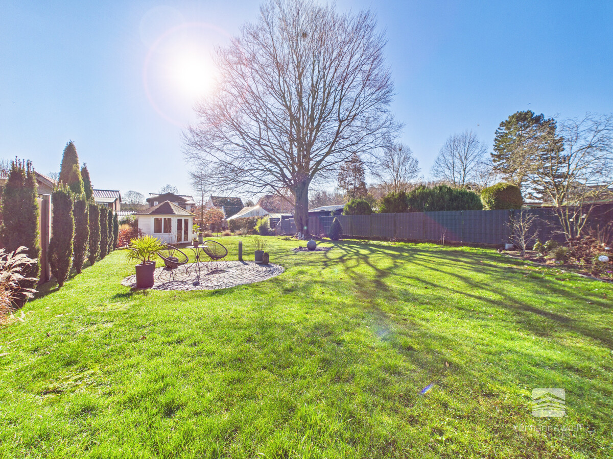 Die liebevoll angelegte Grünfläche begeistert mit harmonischen Blickachsen und charmanten Rückzugsorten: Ein mittig platzierter Freisitz lädt zu entspannten Stunden unter freiem Himmel ein, während eine im altem, gewachsenem Baumbestand platzierte Schaukel einen besonders romantischen Lieblingsplatz entstehen lässt.