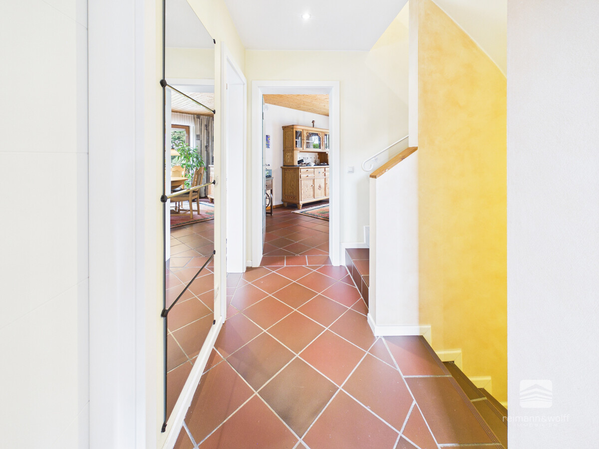Im Erdgeschoss sorgen terracottafarbene Bodenfliesen für eine warme, mediterran anmutende Atmosphäre und erweisen sich zugleich als ausgesprochen pflegeleicht und langlebig.