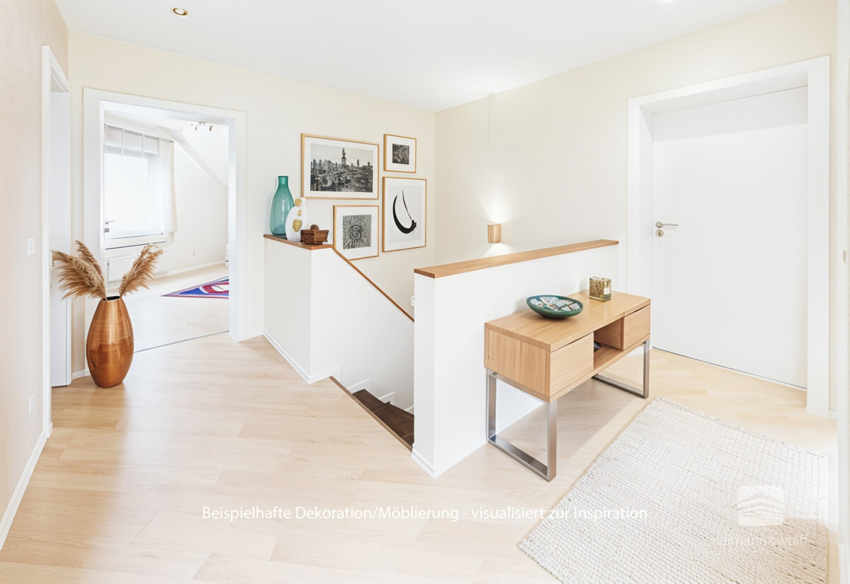 Bereits beim Betreten spüren Sie die durchdachte Architektur: Die zentral platzierte Treppe bildet das Herz des Hauses und verbindet die harmonisch angeordneten Wohnbereiche auf elegante Weise.