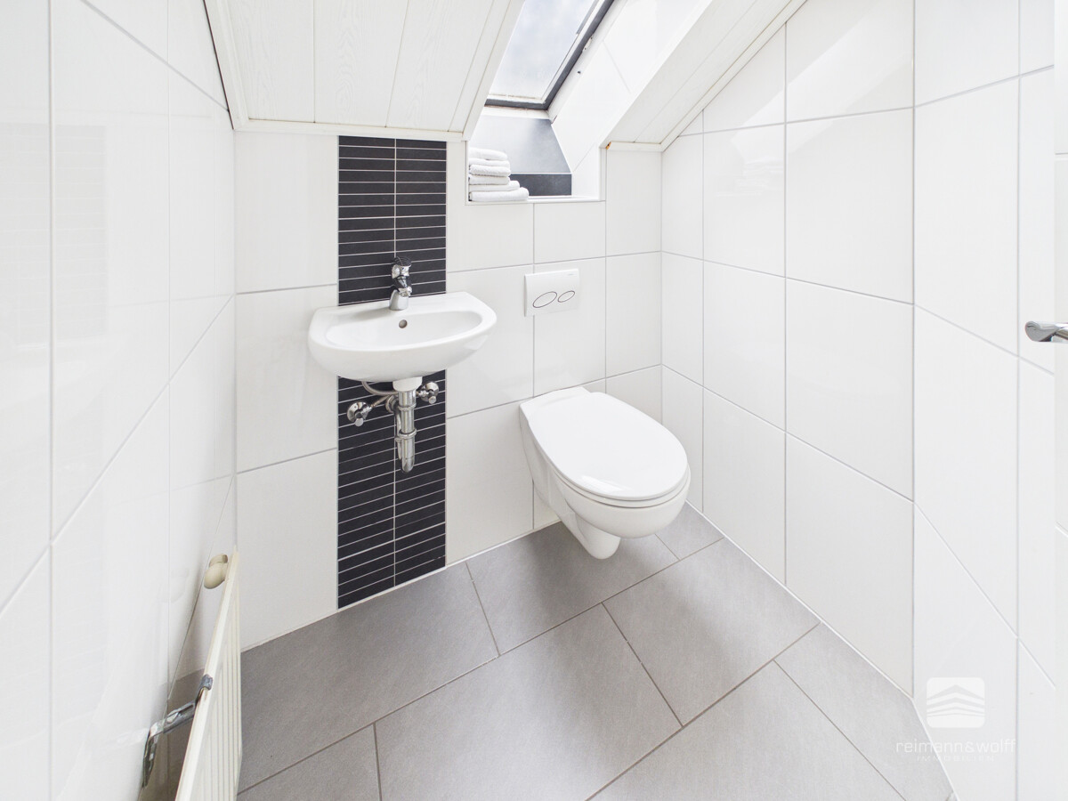Die im Jahr 2010 modernisierten Sanitärbereiche präsentieren sich in zeitgemäßer Gestaltung und fügen sich harmonisch in das gepflegte Erscheinungsbild des Hauses ein. Das Badezimmer sowie die beiden separaten WCs überzeugen durch eine klare Linienführung und einen freundlichen, frischen Eindruck.